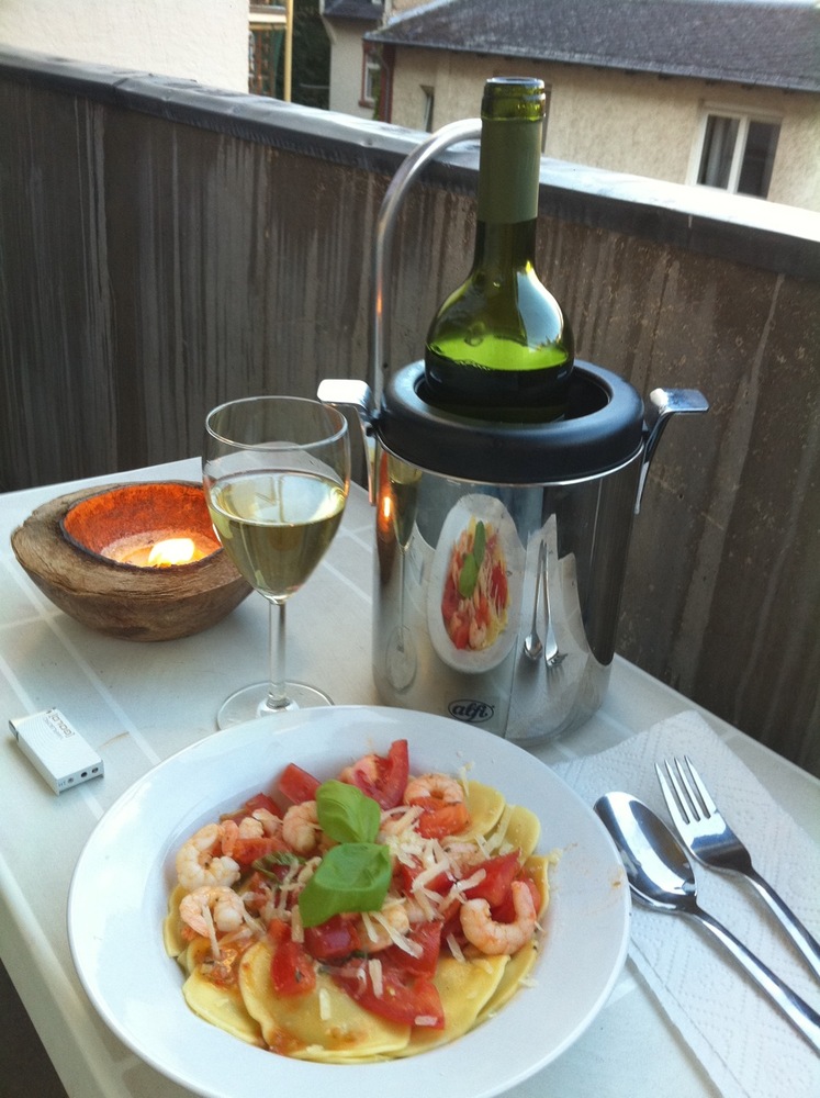 Trüffel-teigtaschen mit Krevetten, Tomate und Basilikum. Dazu etwas Weißer Burgunder.